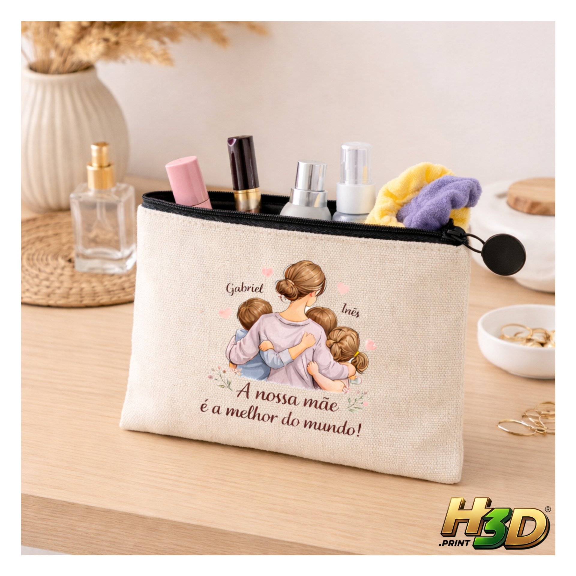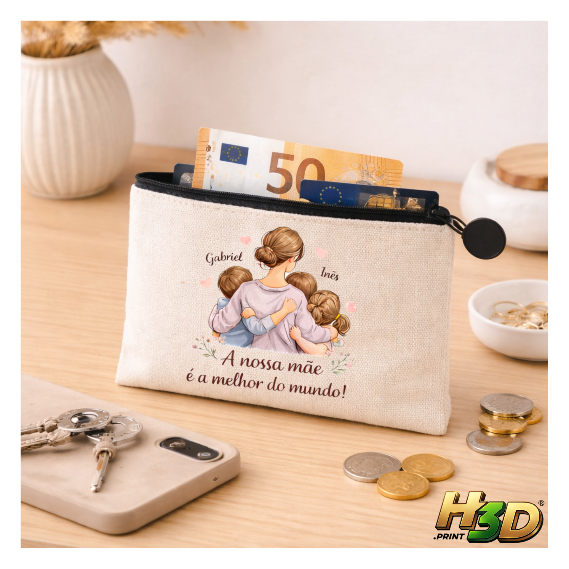 Prática, elegante e totalmente personalizável, esta bolsa é perfeita para guardar os teus essenciais do dia a dia com um toque especial.