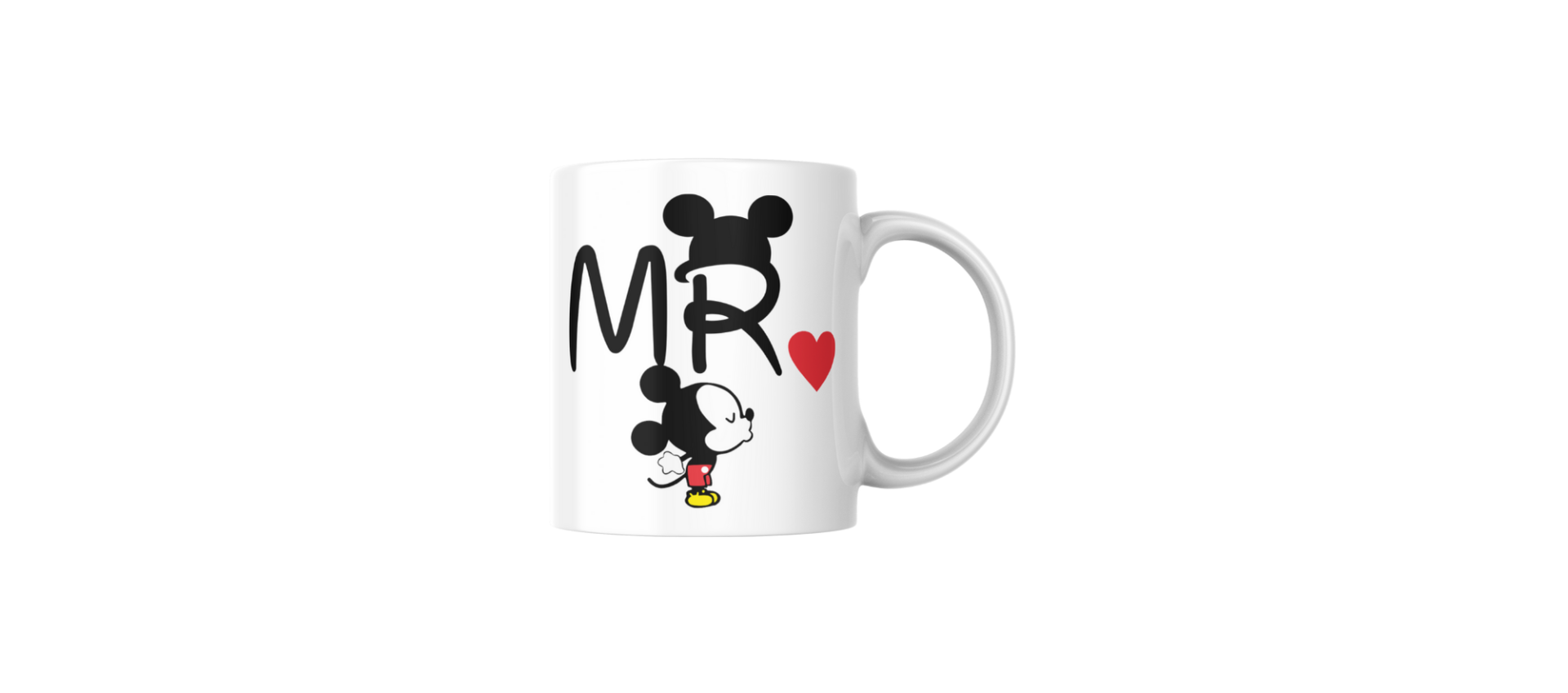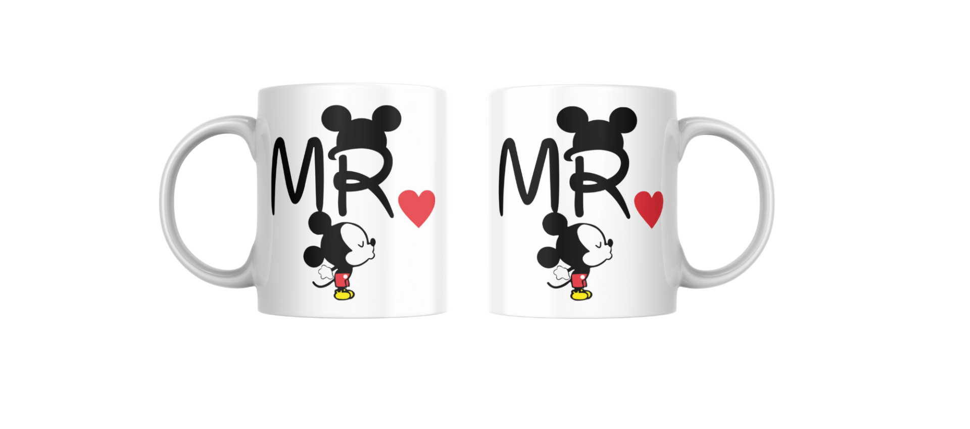 Canecas brancas com desenhos de Mickey Mouse e texto MR com coração vermelho