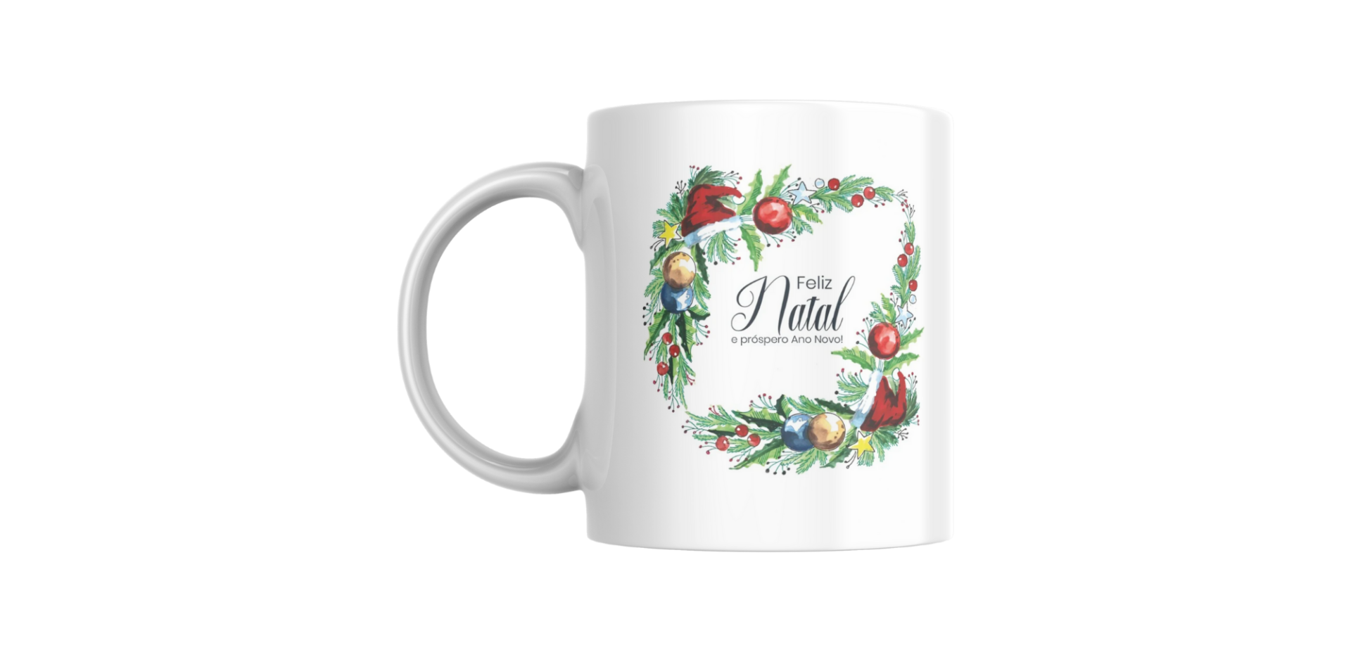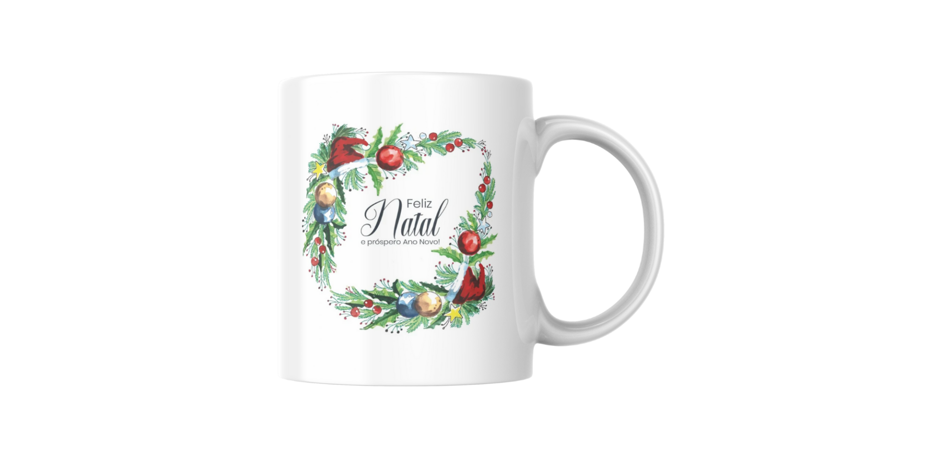 • Caneca branca com estampa natalícia e texto de felicitação no centro