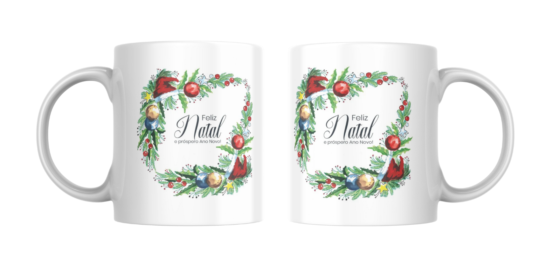 • Canecas brancas com decoração natalícia e texto festivo
