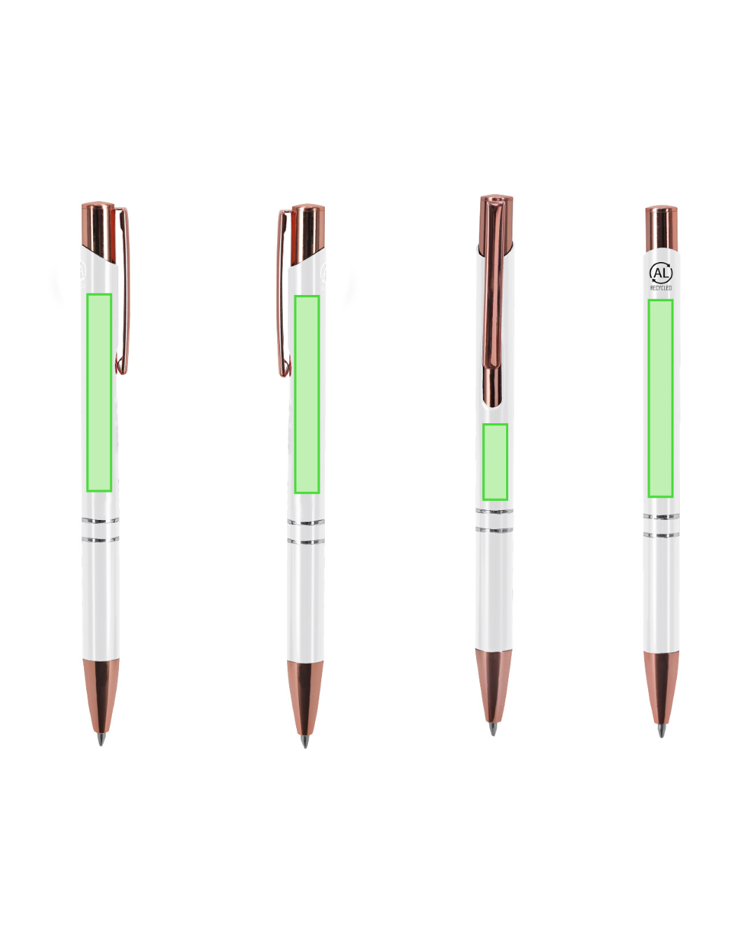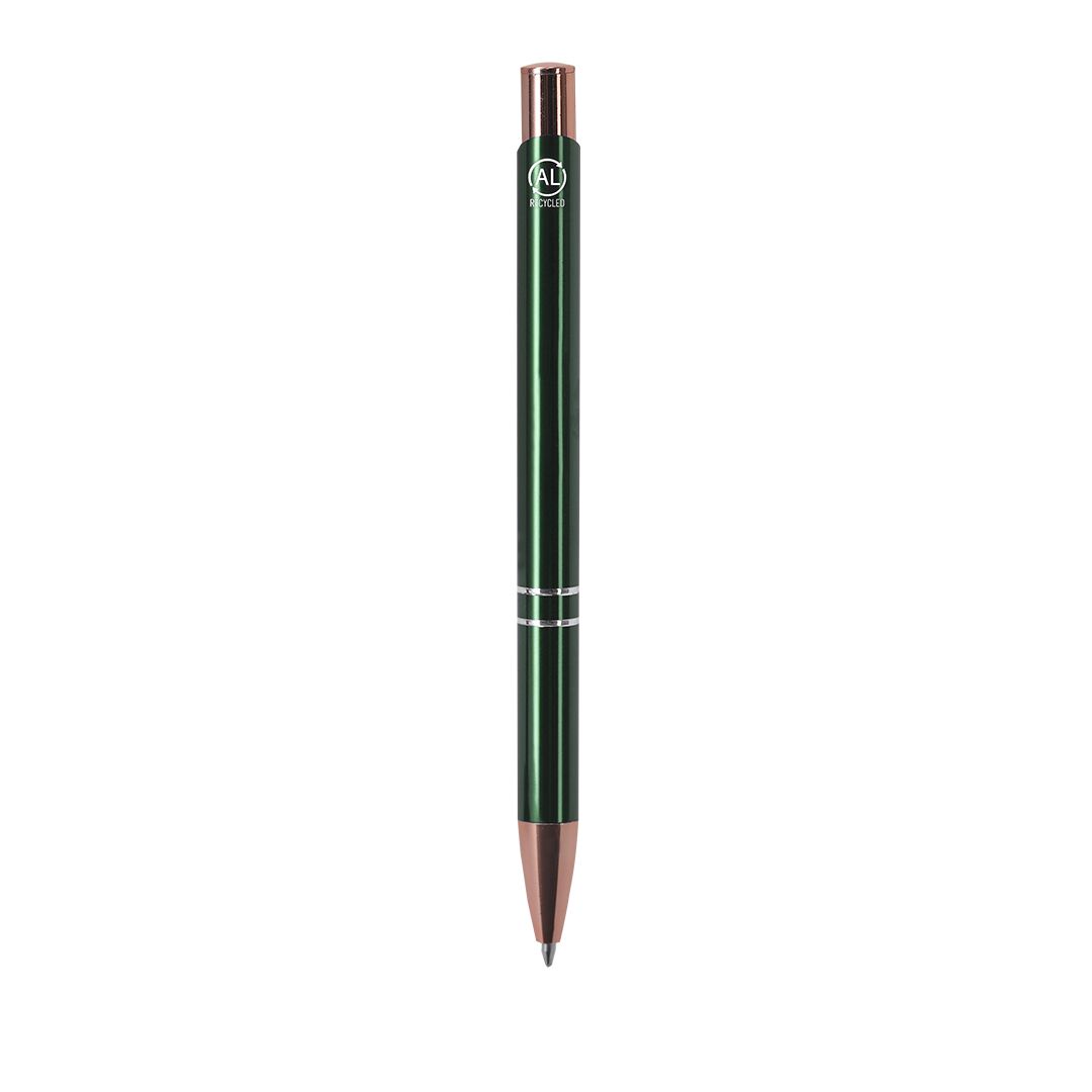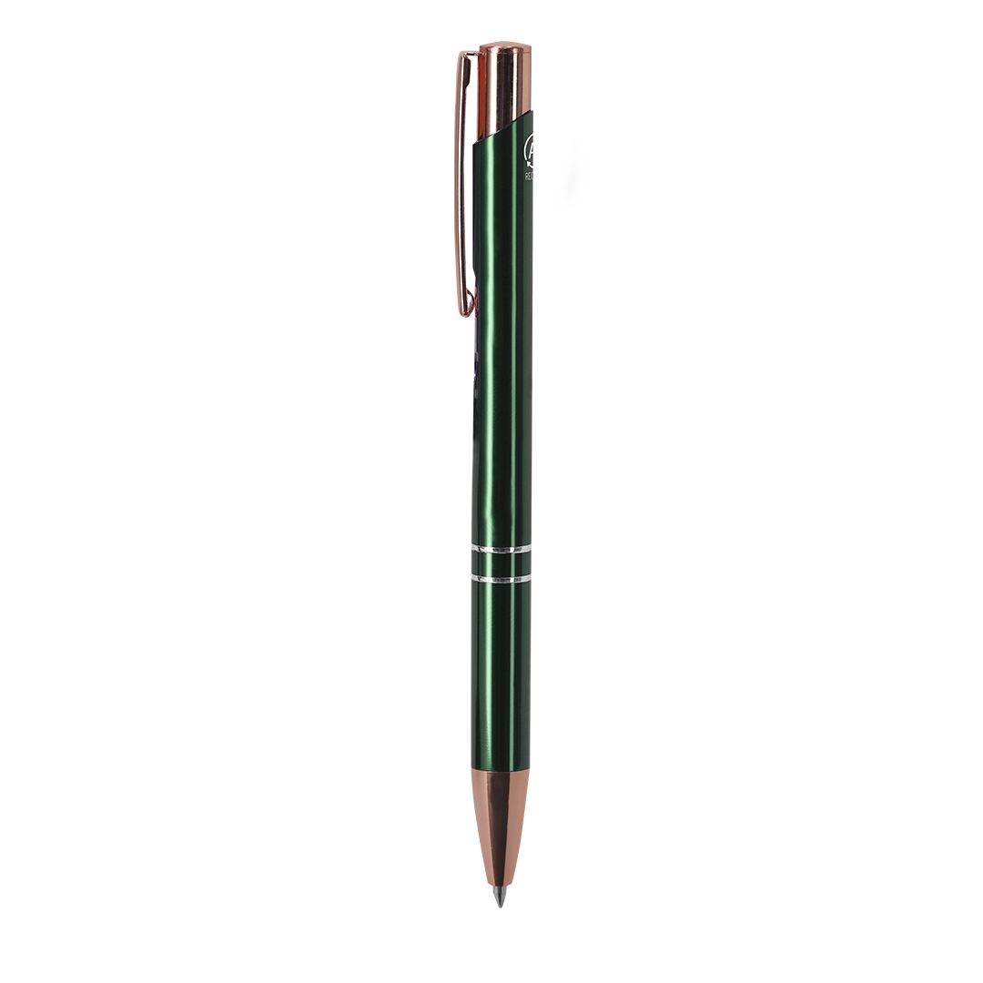 Esta caneta de mecanismo de botão destaca-se pelo seu design sofisticado, combinando um corpo em alumínio reciclado com detalhes em acabamento ouro rosa, criando um visual moderno e premium — ideal para quem quer marcar a diferença.