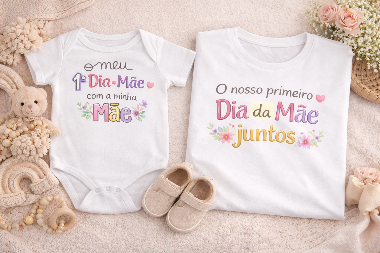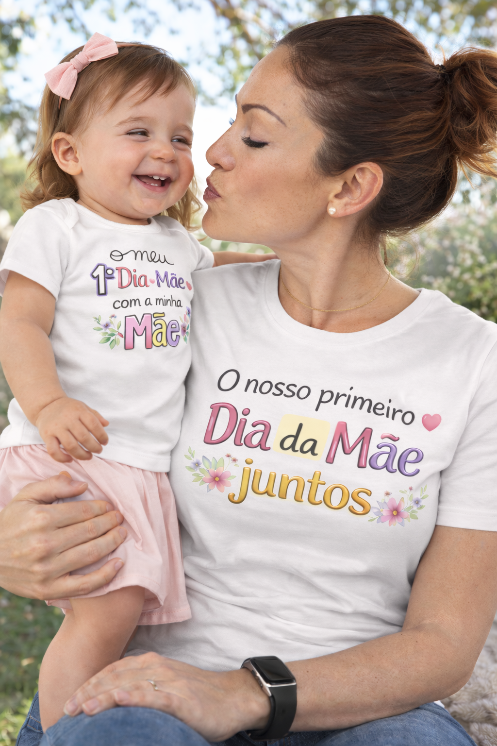 O body do bebé traz a frase “O meu 1º Dia da Mãe com a minha Mãe”, enquanto a t-shirt da mãe completa o momento com “O nosso primeiro Dia da Mãe juntos” — criando uma ligação única e inesquecível.